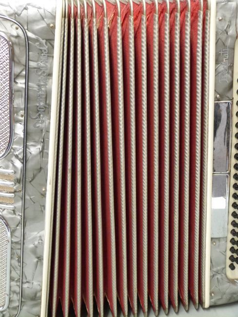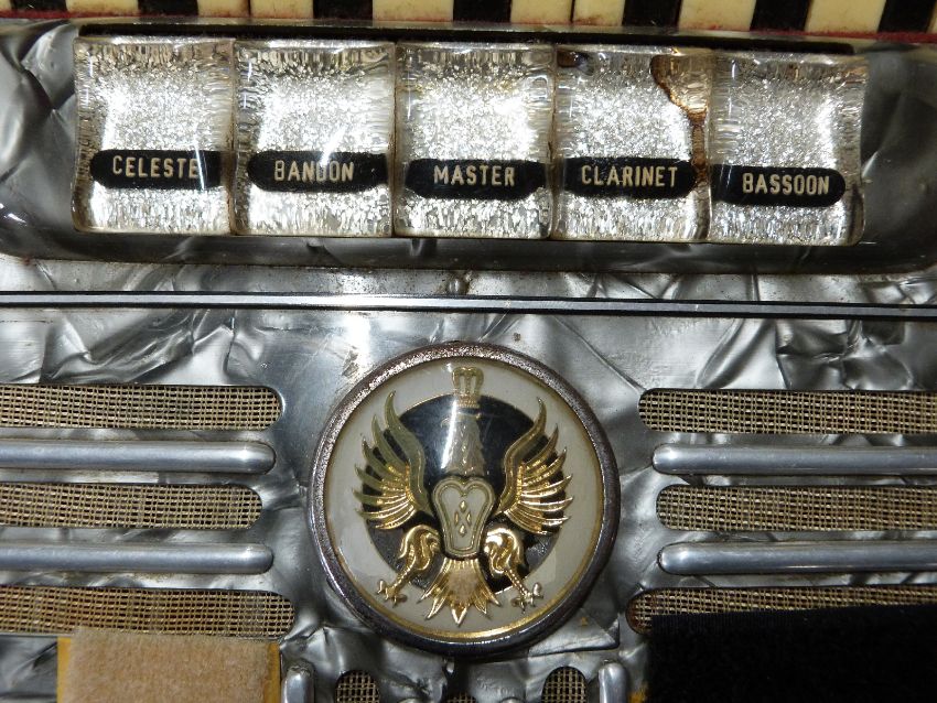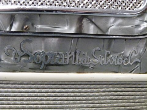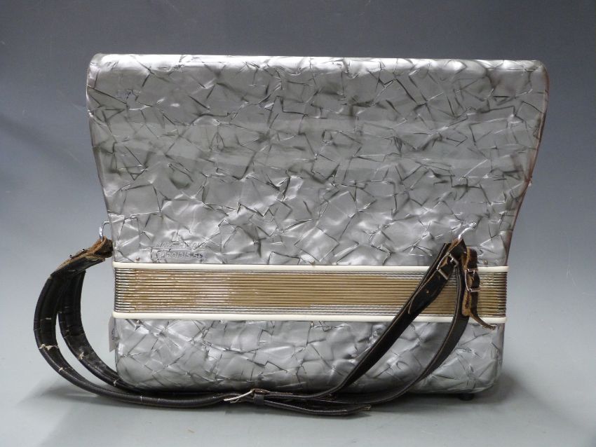 Soprani di Silvio Recanati Italian 120 bass piano accordion, c1950/1960's in grey pearloid finish, five treble couplers and two bass couplers, numbered 41/120/3/5, 5+2, in original carry case