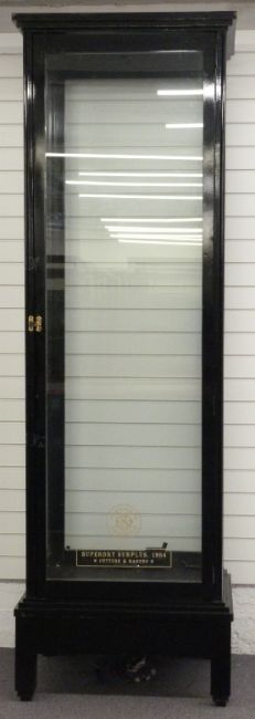 Ex Superdry tall glazed display cabinet or shopfitting / haberdashery cabinet with gloss black finish, the central glazed section with branding for Superdry Surplus 1954, W85 x D74 x H264cm