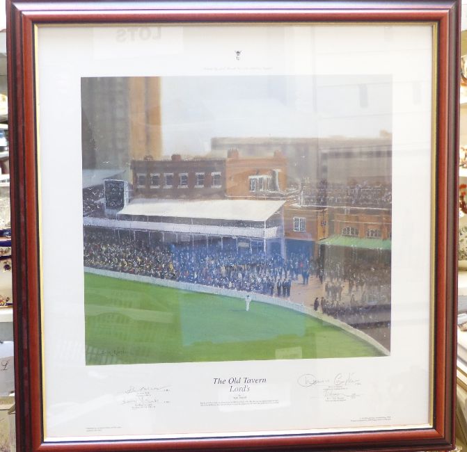 A framed limited edition print 'The Old Tavern, Lords' by Jack Russell, signed by the artist and Sir Harry Secombe, Sir John Mills, past presidents of The Lords Taverners and Dennis Compton (Middlesex and England), 41cm x 44cm