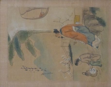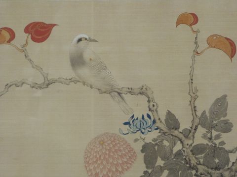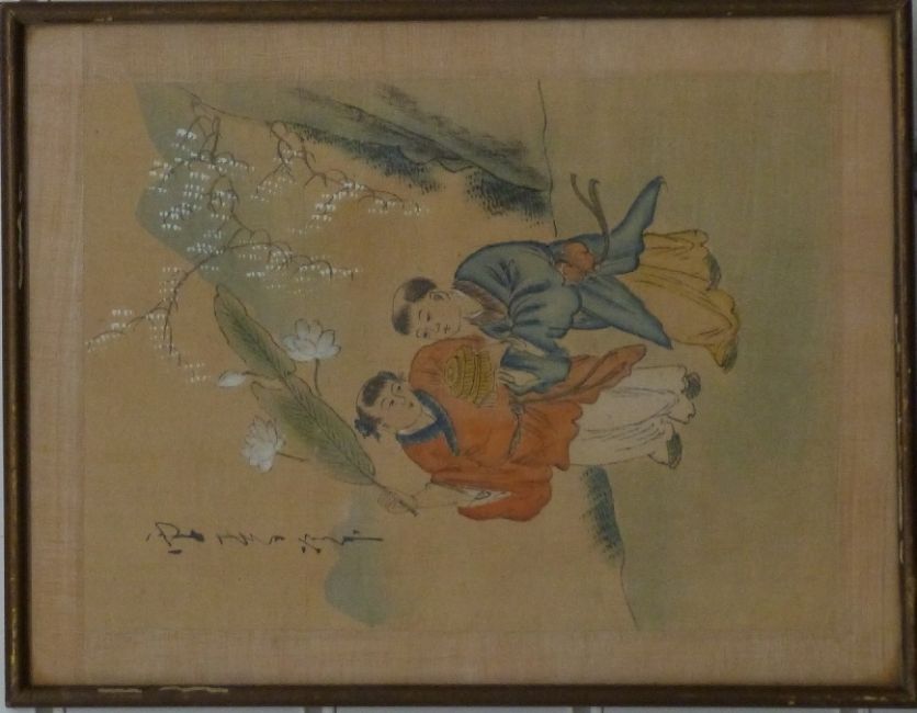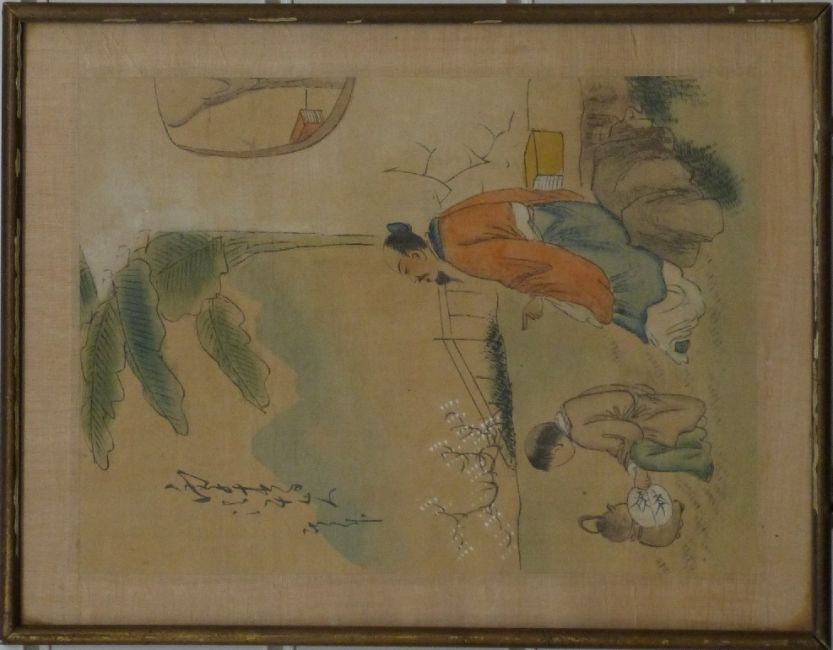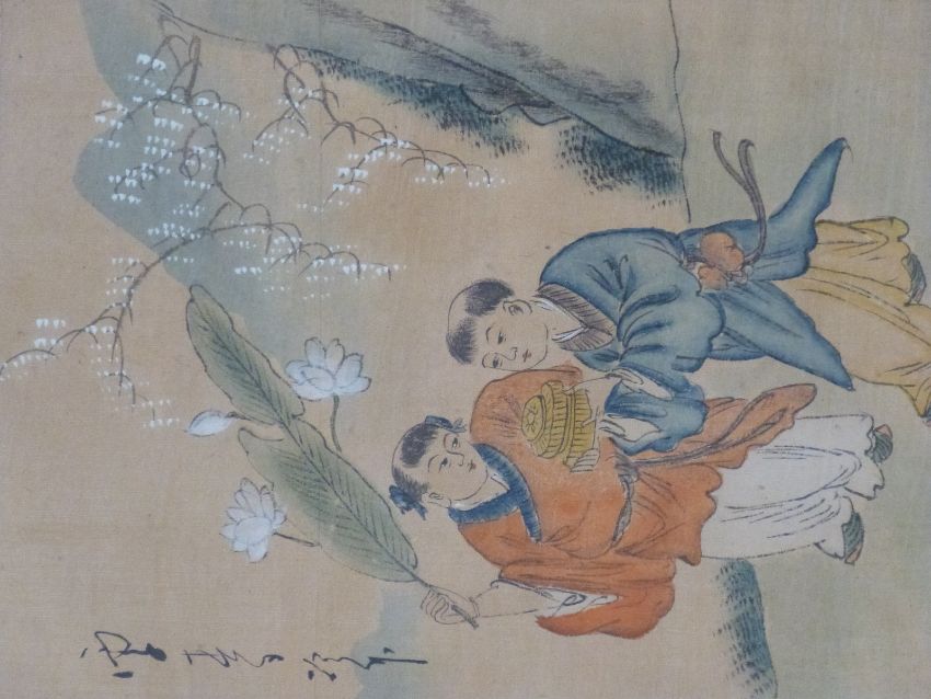 A 19hC / early 20thC Chinese watercolour of flowers and birds on silk with seal mark (46 x 54cm) together with two smaller watercolours on rice paper of pastoral scenes