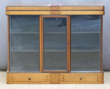 Victorian/early 20thC oak and mahogany shop fitting, haberdashery or display cabinet with lift up compartment to top, glazed middle section with central door and two drawers to base, W108 x D33 x H88cm