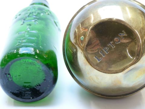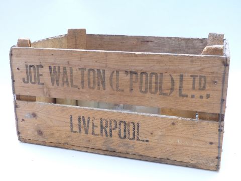 A collection of glass and stoneware bottles to include Nibletts and R Whites etc together with Lipton's British Empire Exhibition brass tea caddies, all in a vintage Joe Walton of Liverpool crate