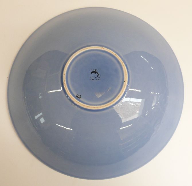 Poole Pottery large pedestal bowl decorated with blue and orange pattern on a yellow ground, H9cm, D34cm