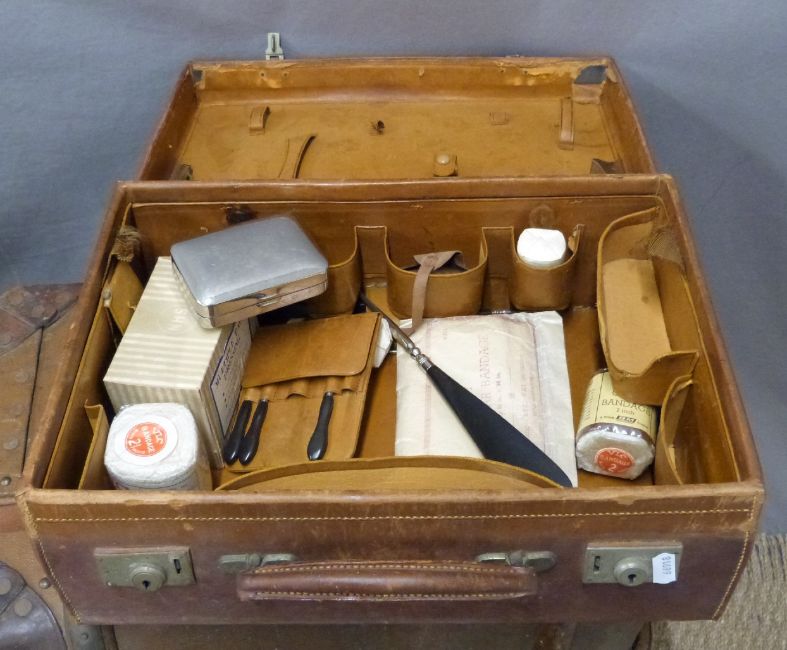 Collection of vintage luggage including ash bound steamer trunks, leather suitcases etc., width of largest 92cm