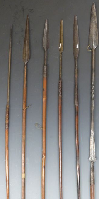 Six 19thC African spears with leather bindings and worked handles, various tribes. Maximum length 260cm
