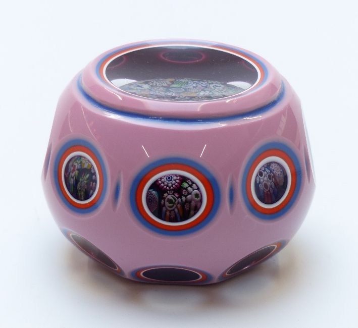 John Deacons faceted quadruple overlaid glass paperweight with millefiori centre featuring five Baccarat style animal canes, Clichy style rose canes and cane to the base signed JHD 2010, 90mm in diameter.