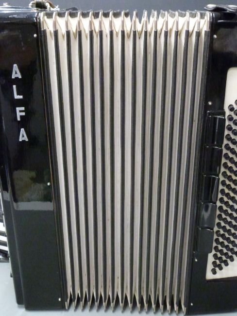 Alfa 120 bass piano accordion c1960's in black lacquered finish, 11 treble couplers and five brass couplers number 469, in original carry case