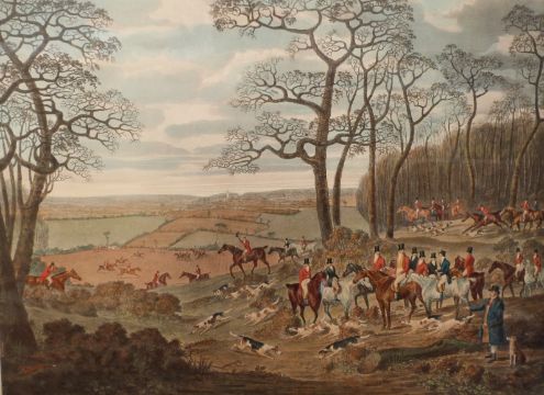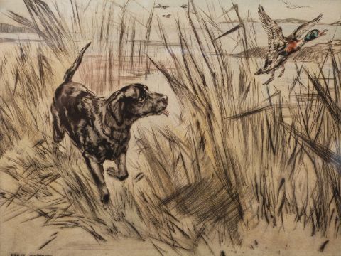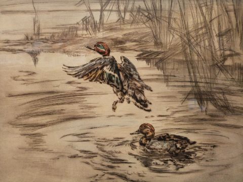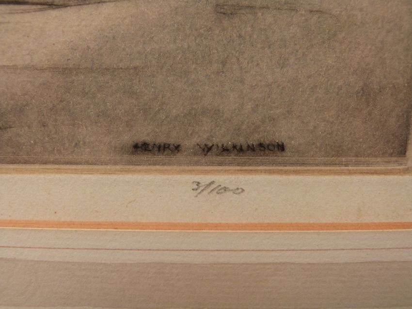 Henry Wilkinson pair of signed limited edition (59/100 and 3/100) coloured etchings of ducks, each 27 x 31cm, and a hunting print dated 1831, 48 x 64cm