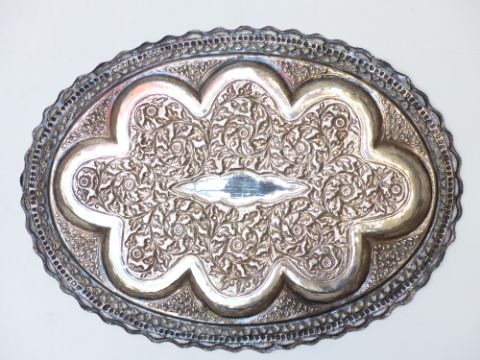 Burmese or similar white metal oval tray with pierced rim and embossed decoration, length 30.5cm, weight 250g