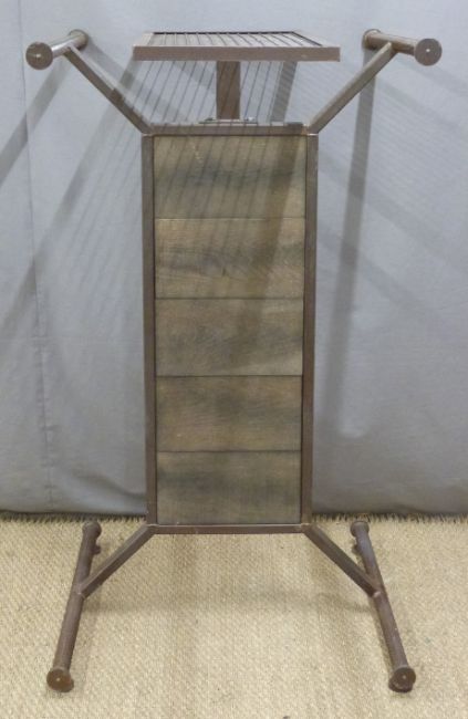 Ex Superdry industrial style metal clothes rail or shop fitting / haberdashery display stand with central wooden panel and two hanging rails, W75 x D80 x H130cm