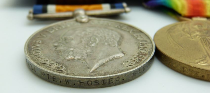 British Army WWI medals comprising War Medal and Victory Medal, named to 5834 W Hosier 1/4th Battalion Glosters/ Gloucestershire Regiment