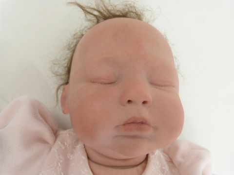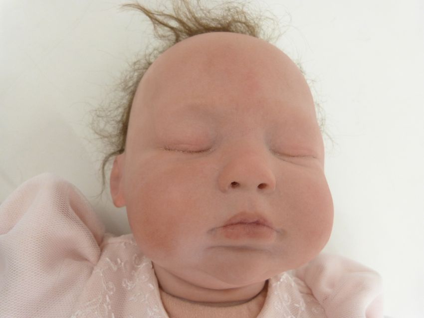 Melanie Seddon Tinkerbell collection silicone doll with closed mouth and eyes and brown hair, in pink outfit, 48cm tall