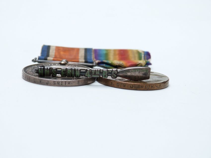 British Army WWI Medals comprising a war medal and victory medal named to 11517 Pte. G.W.J. Smith East Surrey Regiment together with two silver shooting medals and badges etc