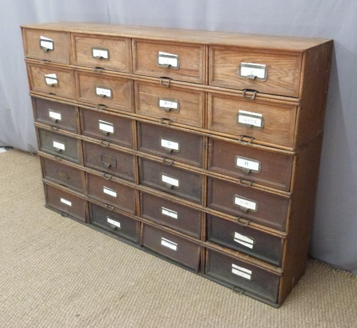 Amona office/shopfitting/haberdashery Stolzenberg oak filing cabinet with lift and slide fronts with provision for labels in two stackable parts providing 26 compartments. W165 x D37 x H114cm