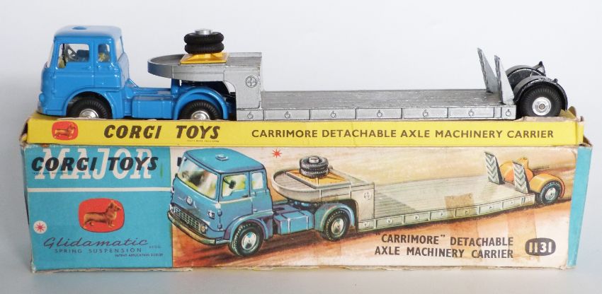 Corgi Major Toys diecast model “Carrimore” Detachable Axle Machinery Carrier with mid blue body and grey bed, 1131, in original box with display stand.