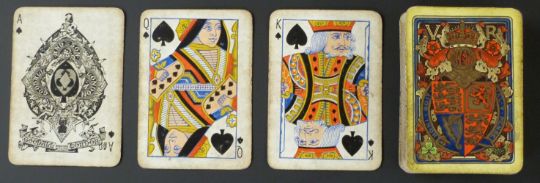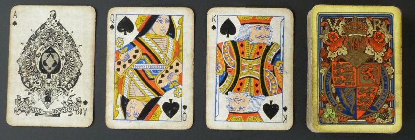 Goodall  & Son, London playing card pack to commemorate Queen Victoria’s Jubilee in 1887. Backs with coat of arms and VR within yellow border. Standard double ended cards. 52 cards