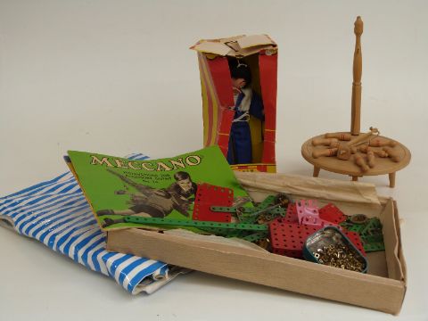 A small collection of Meccano parts together with a Pelham Puppet in original box, inflatable child's boat and a game of bar skittles