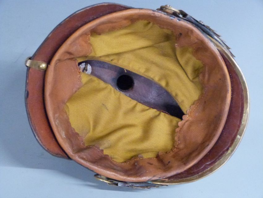 German / Bavarian Army 19thC black leather pickelhaube helmet complete with scales chin strap and leather and cloth liner