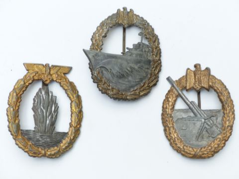 German Navy WWII Minesweeper sub-chaser and Escort Vessel War badge together with a Destroyer War Badge and a Coastal Artillery example