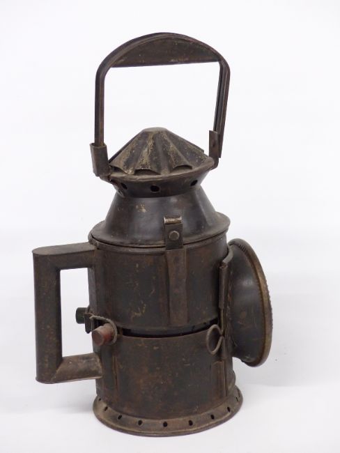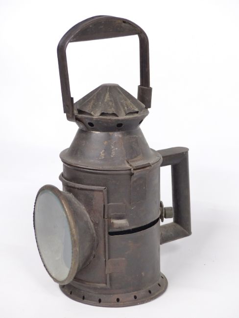 Possibly Great Eastern or LNER three colour railway hand lamp with sliding knob filters, height 36cm