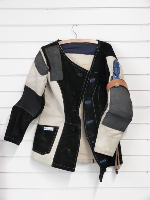 Gehmann target shooting jacket with Evans Sports Equipment leather accessories, size 50.