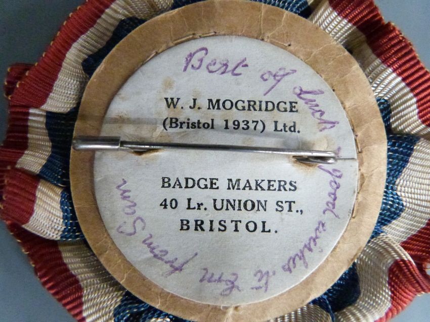 Winston Churchill 'Our Victorious Leader' rosette made by W J Mogridge, Union Street, Bristol