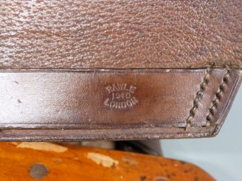 WWII mule saddle with metal and wooden frame and original stitched leather, probably Artillery or Machine Gun Corps Regiments, stamped Rawle of London 1940