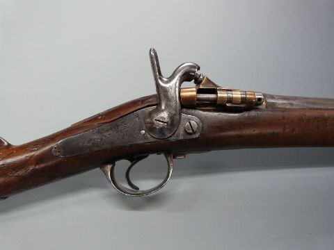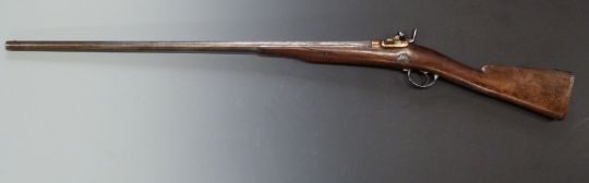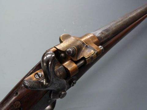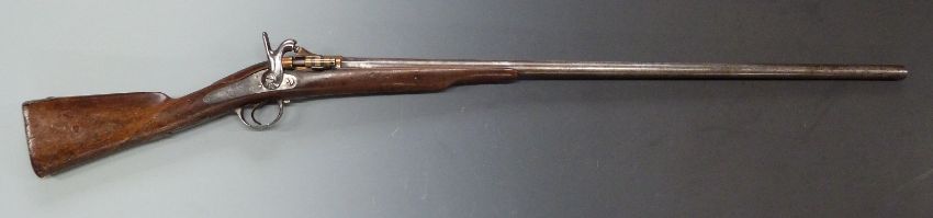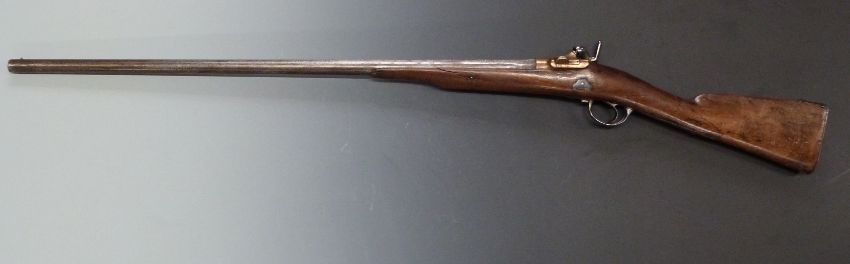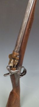 French 1867 model percussion hammer action Tabatiere rifle converted to a 12 bore shotgun with engraved hinged bronze Snider style breech loading action, engraved steel hammer, locks, trigger guard and butt plate, chequered grip and 34 inch barrel, overall length 129cm, length of pull 32.5cm, serial number 772, with laminated description card. PLEASE NOTE THAT A VALID RELEVANT FIREARMS/SHOTGUN CERTIFICATE IS REQUIRED TO HANDLE/PURCHASE THIS ITEM.