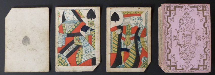 Possibly Woolley & Sabine ‘Waste’ playing cards with bottom right corner cut off all cards (to avoid tax). Homemade ace of spades. Standard full length courts. Gold decorative backs on pink background. 52 cards. c1850