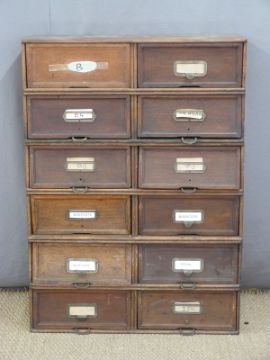 Amona office/shopfitting/haberdashery Stolzenberg oak filing cabinet with lift and slide fronts with provision for labels in three stackable parts providing 26 compartments. W82 x D47 x H104cm
