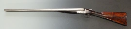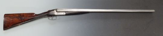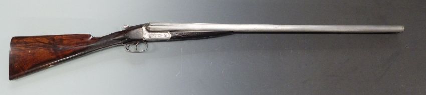 Henry Tolley 12 bore side by side shotgun with named and engraved locks, engraved underside, trigger guard, top plate and thumb lever, chequered grip and forend, double trigger, vacant cartouche to the underside of the stock and named 30 inch Damascus barrels ¾ and unchoked, overall length 119cm, length of pull 38cm, serial number 18683. PLEASE NOTE THAT A VALID RELEVANT FIREARMS/SHOTGUN CERTIFICATE IS REQUIRED TO HANDLE/PURCHASE THIS ITEM