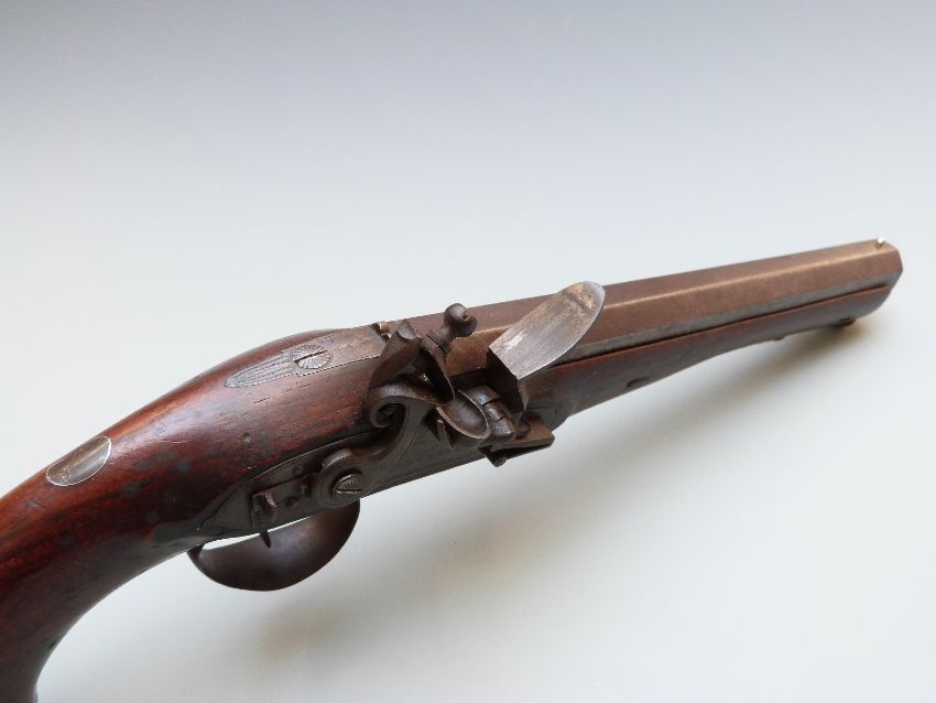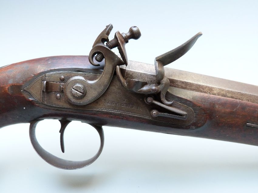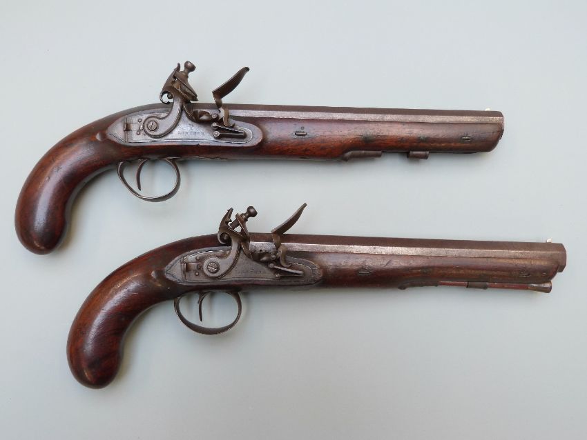 A pair of Lowther of London flintlock hammer action duelling or target pistols named locks, with French style hammers, safely cock catches, engraved pineapple finialled trigger guards and top straps, wrist cartouches and 9.5 inch octagonal barrels, overall length 39cm.