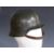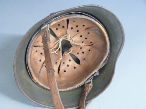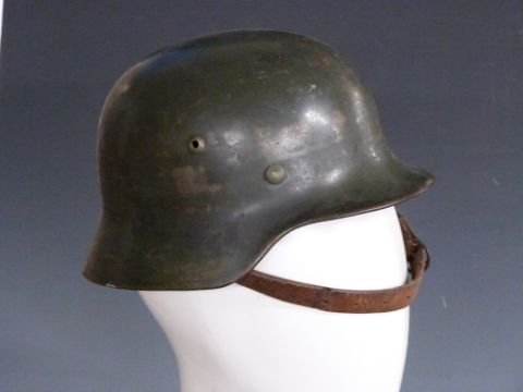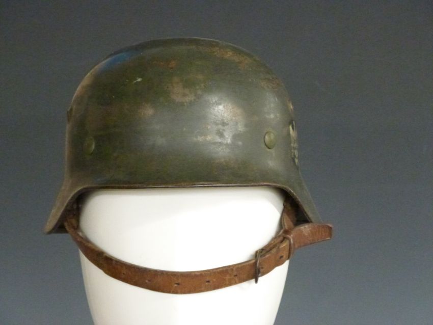 German Army WWII steel helmet with single decal to side, stamped SE62 complete with leather liner and chin strap