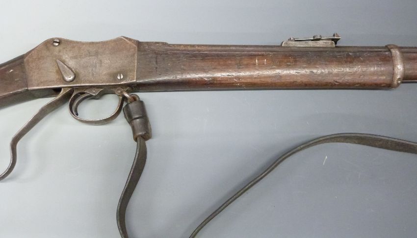 London Small Arms Company Enfield Martini-Henry action .577/ 450 1874 Mk II carbine rifle with action engraved 'LSA & Co 1874 II 2' under crown, leather sling, adjustable ladder sight, stock stamoed '39/15' '34' '11' '2' and 'R M Enfield' and 'WD' under ministry broad arrow in roundel, steel ram-rod and 33 inch barrel stamped st the breech 'S.X' and on the top flat '24', overall length 125.5cm, serial number EE64.