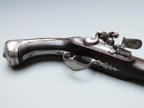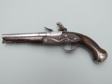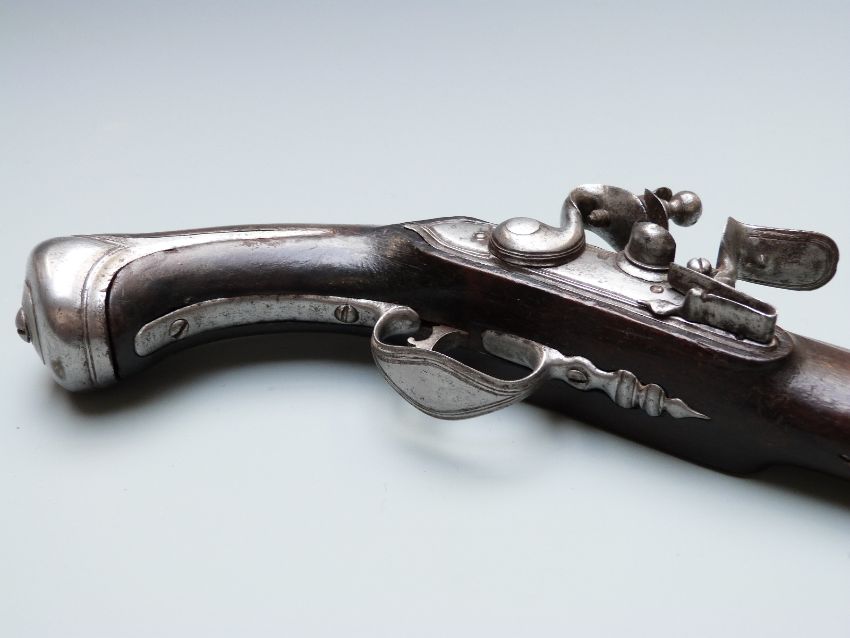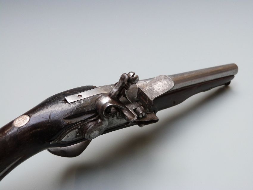 Lazard Queen Anne type flintlock hammer action coat pistol with iron trigger guard, butt plate, and mounts, iron tipped wooden ram-rod and named 6.5 inch multi-stage part octagonal barrel, overall length 29.5cm.