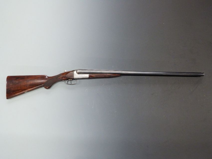 Edwinson Green of Cheltenham and Gloucester 12 bore side by side ejector shotgun with engraved scenes of dogs and birds to the locks, engraved underside, trigger guard, top plate and thumb lever, chequered semi-pistol grip and forend, carved teardrop to the wrist, vacant cartouche to the underside of the stock, double trigger and 28 inch barrels choked ½ and ¼ and engraved 'New Barrels by Fletchers Ltd Gloucester', overall length 112.5cm, length of pull 36.5cm, serial number 5013 PLEASE NOTE THAT A VALID RELEVANT FIREARMS/SHOTGUN CERTIFICATE IS REQUIRED TO HANDLE/PURCHASE THIS ITEM.