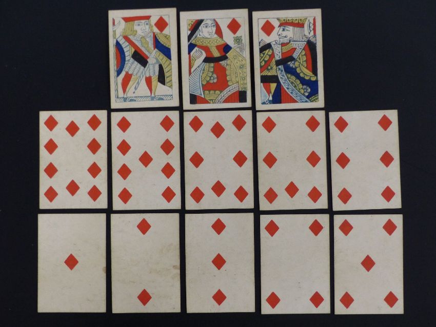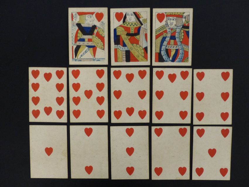Reynolds & Sons, England playing cards. Old Frizzle ace. Standard full length courts. Backs with elaborate design of Britannia and ships with scrolls on green. 52 cards. c1840
