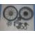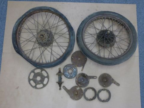 Two vintage motorbike wheels and a quantity of brake and hub parts