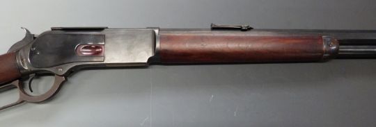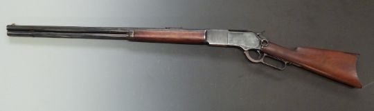 Winchester 1876 model .50-95 underlever rifle with replacement Italian barrel, ladder sight, sling suspension loop, sliding storage compartment to butt and 27.5 inch octagonal barrel, overall length 123cm, serial number 61442.