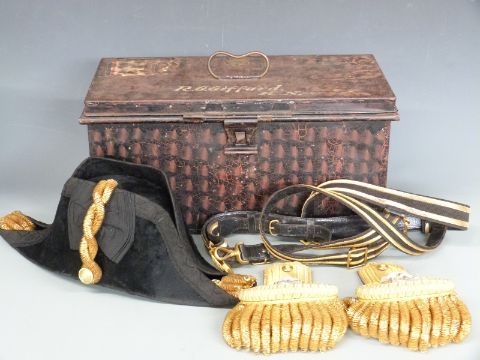 Royal Navy officer's bicorn hat, epaulettes and sword belt with sling, supplied by Gieves of London and Edinburgh, together with a Gieves storage box for R G Giffard RN