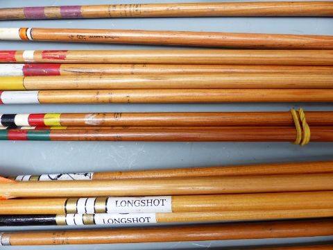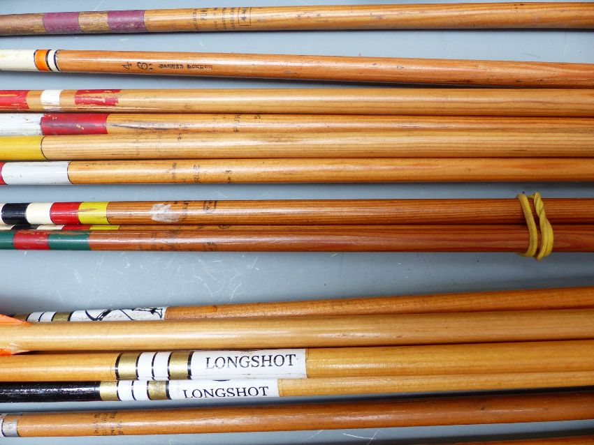 A large collection of vintage wooden arrows and blanks and two tourist spears