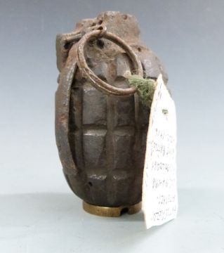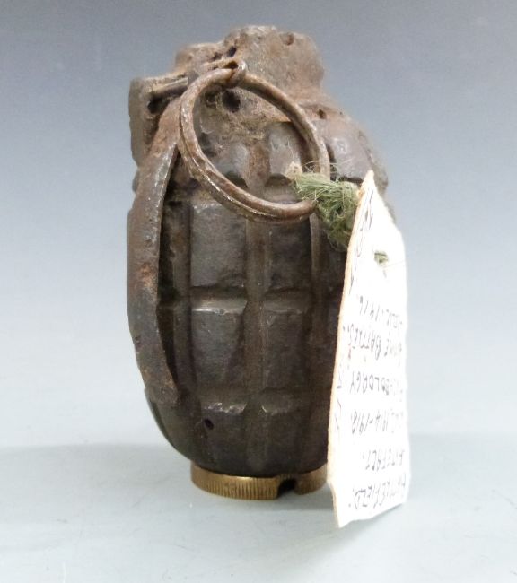 British WWI inert Mills bomb No5 MK1 'pineapple' grenade, 10cm long.