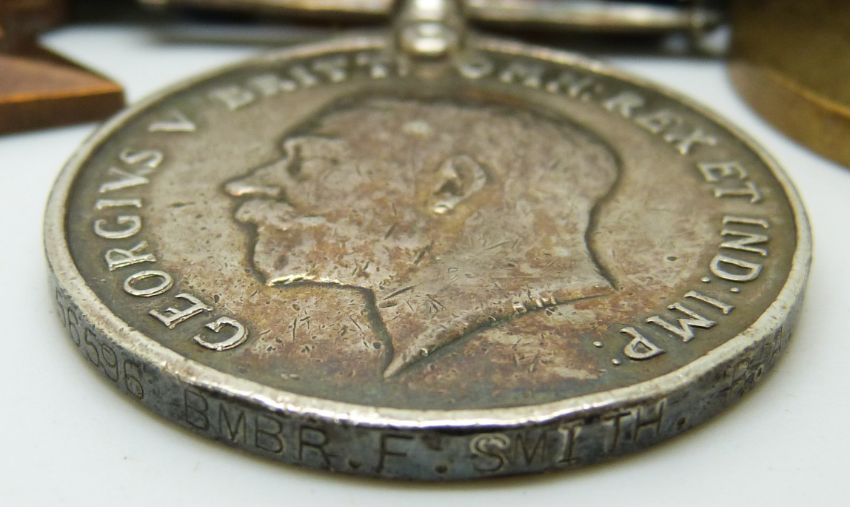 British Army WWI medals comprising 1914 'Mons' Star with clasp, 5th August/22nd November, War Medal and Victory Medal named to 56596 Bmbr F Smith, Royal Horse Artillery
