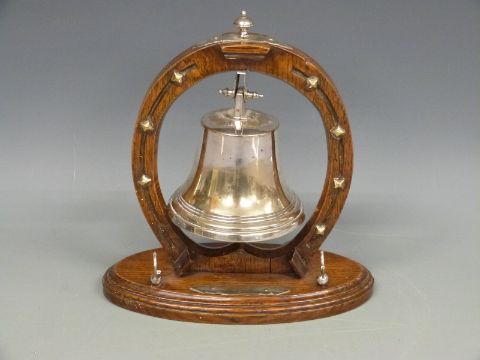 Edwardian plate bell gong in an oak horse shoe shaped frame with brass fittings, height 27.5cm