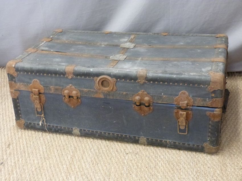 Two vintage metal burned trunks. Largest W87 x D53 x H50cm