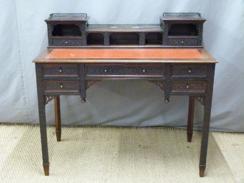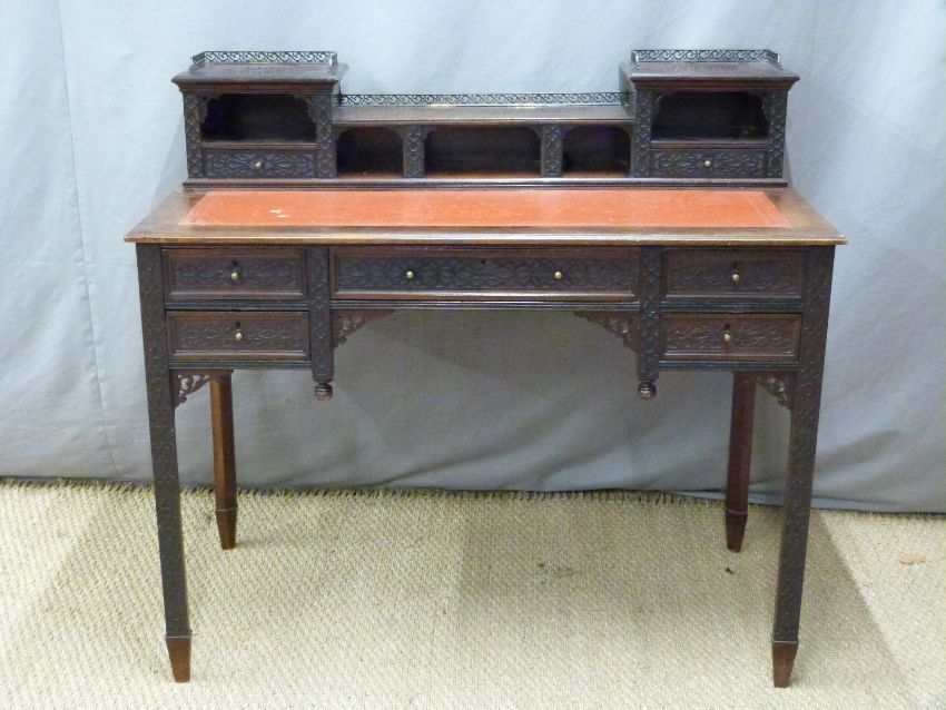 19th or early 20th century carved mahogany leather inset desk with an arrangement of drawers and cubby holes raised on canted tapering legs with spade feet. W107 x D58 x H76cm