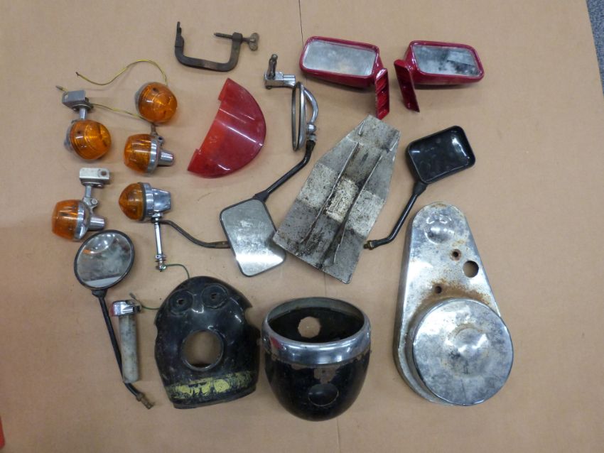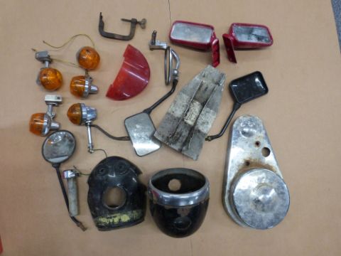 A quantity of motorcycle spares including indicators, chaincase etc