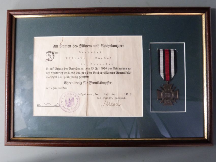 German Army WWI Hindenburg Cross medal with certificate, framed and mounted