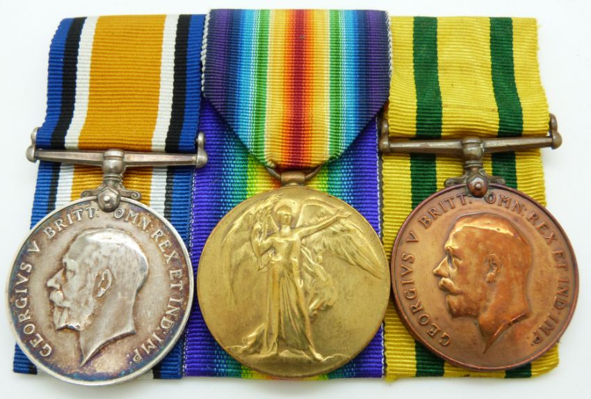 British Army WWI medals comprising War Medal Victory Medal and Territorial Force War Medal named to 203092 Pte G H James, Glosters/ Gloucestershire Regiment