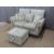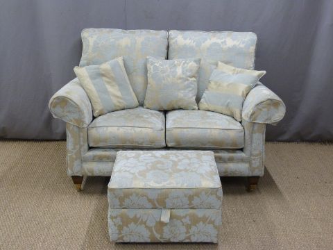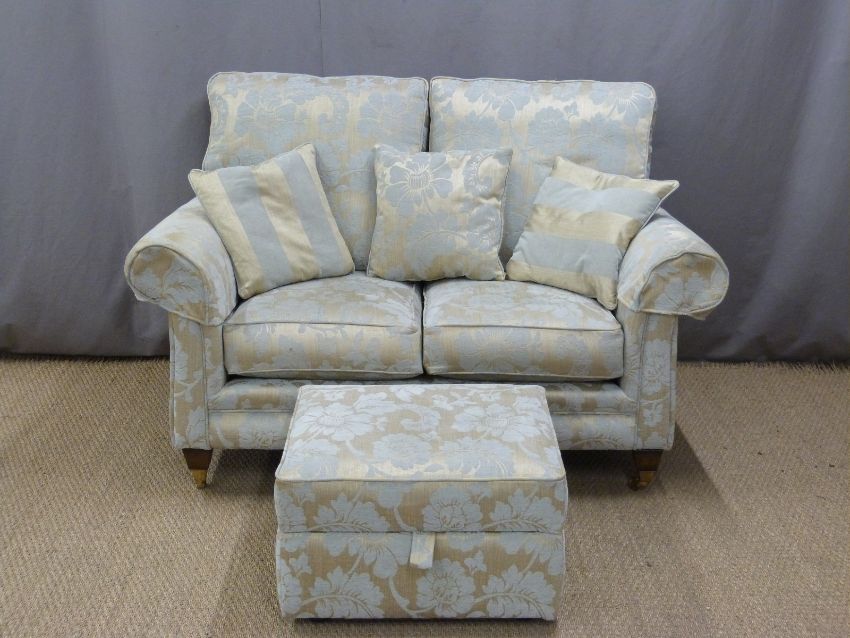Modern two seater sofa with gold flock upholstery, footstool and cushions. W144 x D91 x H100cm
